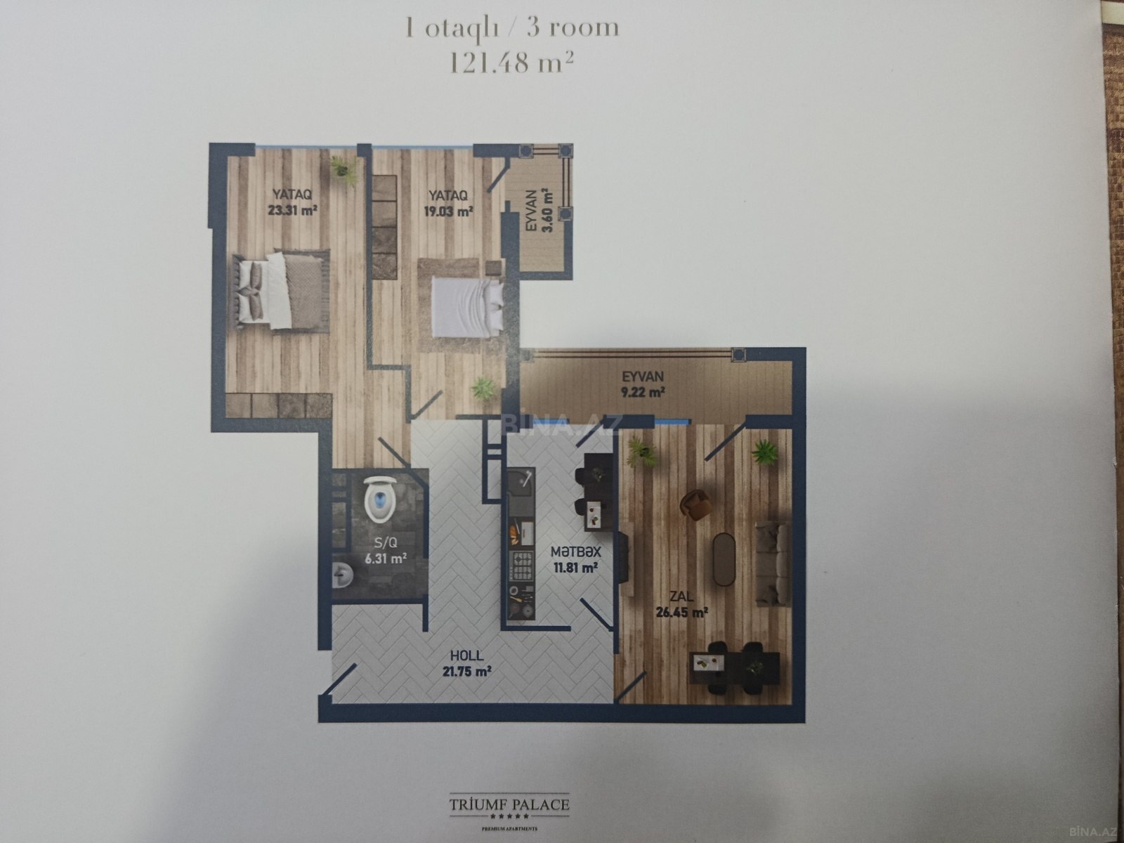 Tecili ! Qiymet Endi !! TRIUMF PALACE YASAYISH KOMPLEKSI . Yuksek keyfiyyetle insa olunmush 17 mertebeli yeni tikili kompleksin 7-ci mertebesinde , umumi sahesi 121.5 kvm olan temirsiz(pod mayak) menzil satilir . Menzil qanuni 3 otaqlidir . Kompleks temire buraxiliq , Heyet tamamlanma ishleri gedir . Kompleksin nezninde , Futbol meydancasi , Tennis kortu Ustu aciq kinoteatr Piknik ve istrahet zonasi Fevvare Usaqlar uchun meydnca ve s .var Sakinlerin istifadesine ,muasir SCHINDLER liftleri istifadeye verilib .
