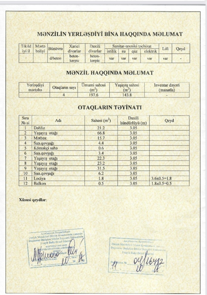 Ekskluziv təklif !!! Bazar dəyərindən çox ucuz qiymətə satılır !!!! çıxarış sənədi var və ipotekaya yararlıdır. Çıxarışda qeyd olunan sahəsi 197.6kvm. MƏNZİL İLK DƏFƏ SATIŞA ÇIXIR. Nərimanov heykəlinin yanında. Binanın sakinləri reputasiyalı ve elit insanlardır. Həyəti 7/24 çox dəqiq mühafizə olunur. Həyətyanı sahədə istirahər zonası mövcuddur. Mənzilin özünə məxsus yerüstü parklanma zonası mövcuddur. Qanuni 4 otaqlı mənzildir. 205 kvm sahəsi var. (İstəyə uyğun olaraq 5 otaq etmək mümükündür və, əlavə olunan otağa pəncərə düşəcək) Mənzil dəniz və şəhər mənzərilidir. Elimlər metrosuna və H.Cavid parkına 1-2 dəqiqəlik piyada məsafədə. Məncil çox işlıqlı və müsbət auralı mənzildir. Tək qonaq otağında 3 pəncərə 2 eyvan mövcuddur. Digər otaqların pəncərələri fərqli küçələrə baxır. Mənzil 190 dərəcə mənzərəlidir. Mənzil hazırda butik şourumu kimi istifadə olunur. Mənzilin parapetrləri aşağıda qeyd olunur. TAM YELÇƏKƏN VƏ BÜTÜN OTAQLARA GÜNƏŞ ŞÜALARI DÜŞÜR. Qonaq otağı çox genişdir -sahəsi 66.8 kvm. Mətbəx 16 kvm 3- Yataq otağı var. Yataq otaqlarının ikisində sanitar qovşaq və hamam otağı mövcuddur. 31.5 kvm / 23.2 kvm / 22.3 kvm Ümumilikdə 3 sanitar qovşaq var. MƏNZİLİN TEXNİKİ GÖSTƏRİCİLƏRİ FOTO ŞƏKİLLƏR BÖLMƏSİNDƏ GÖSTƏRİLİB. Xidmət haqqı alıcı tərəfindən 1 faiz təşkil edir.