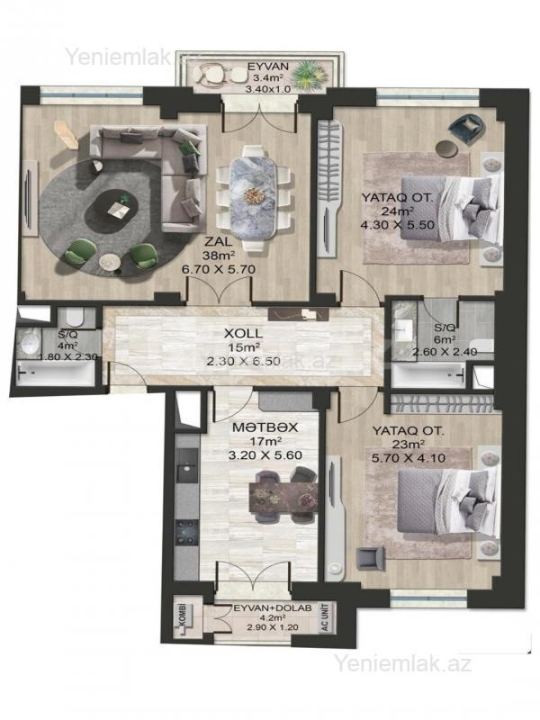 3 otaqlı yeni tikili